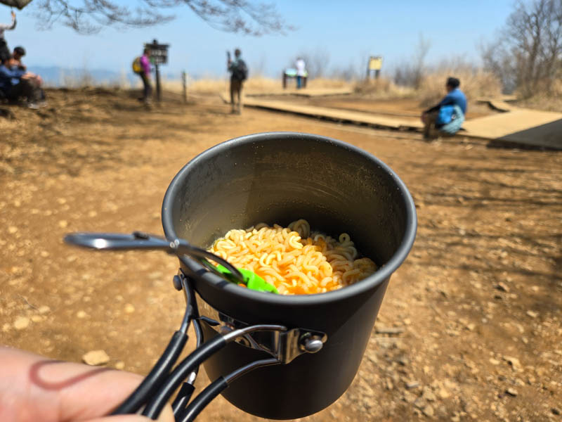今回の昼食はサッポロ一番みそラーメンです。ガスバーナー持参で調理します。前回の掃部ヶ岳と比べてお湯が簡単に沸きました。前回は気温の低さがお湯の沸きにくさに影響していたようです。この日は少し暑いくらいでしたが、それでも熱々のラーメンは美味しいです。今のところ山専用ボトルに水を入れてそれを沸かしていますが、山専用ボトルのスペックを活かせていなくて少々もったいない状況です。夏に備えて冷たい水を入れるようにしようかな。