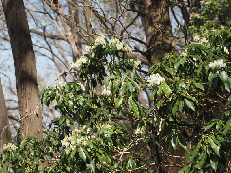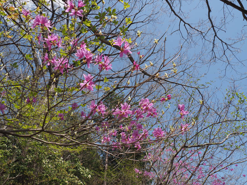 ひとしきり山頂を堪能したら下山します。まずは岩茸石まで同じルートで戻ります。岩茸石からは、川又バス停方面へ向かいます。登山道は平坦な道がしばらく続きます。周りには濃いピンク色のツツジやアセビの花が咲いています。白谷登山口からのルート上はあまり花が咲いていなかったので、嬉しいですね。