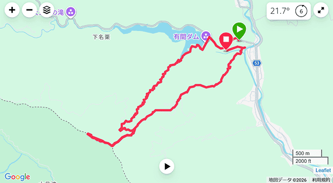 白谷沢登山口から棒ノ折山へ登頂し、帰りは川又バス停方面へ下りるルートです。往路は沢を楽しみ、復路は花を楽しめました。登山口と下山口が異なっていますが、そこまで離れているわけではなく、同じバス停に戻って来られます。急坂もありますが全体で4時間程度の山行であり、ちょうど良いボリュームです。川又方面のルートは途中平坦な箇所が続きますが、高度グラフにも表れていますね。総じて天気にも恵まれて良い新緑ハイキングとなりました。心拍数がやや高めですが、少し暑かったからでしょうか。