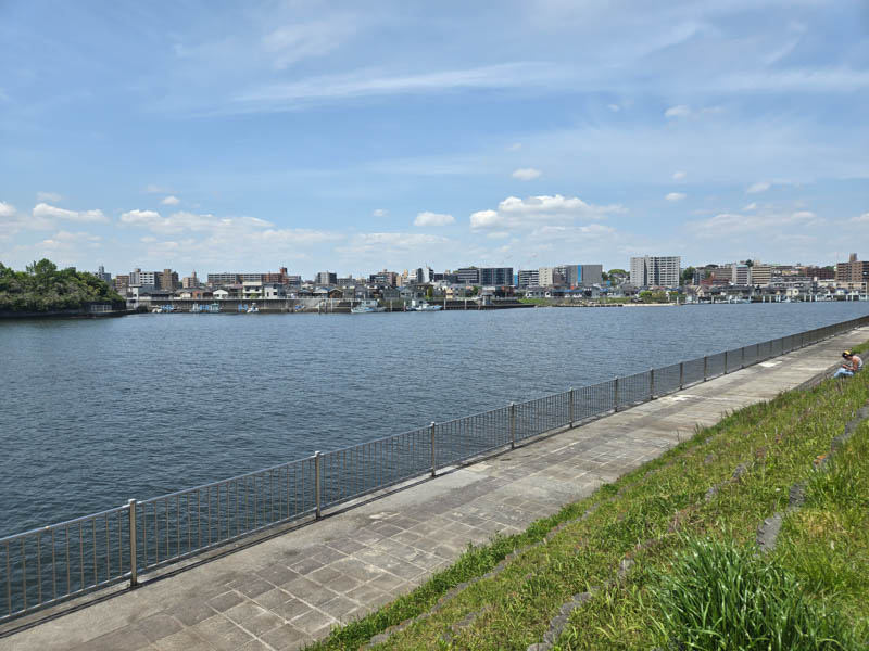 河口に近いエリアは土手がないのですが、それでも道の脇に草花が咲いていて季節を感じられます。橋がある度に信号待ちが発生するので、のんびり河口に向かって進んでいくスタイルです。